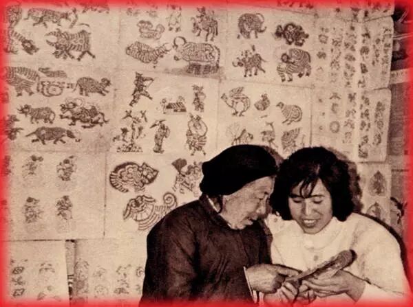 这是那时我母亲剪过的窗花,贴在山东特殊形状的窗口上就构成了这个大图样。它是对生活的一种态度,金鱼和鱼缸代表金玉满堂。这是她剪过的花样,到了若干年后,我去中国西北地区采风,在那里又碰到了很多艺术的母亲,那时我的母亲已经不在人世了,这些艺术母亲继续感染了我。